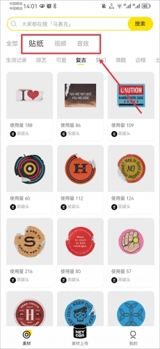 2、在素材界面中,你可以按照贴纸、视频、音效这三个分类,挑选自己喜欢的素材。