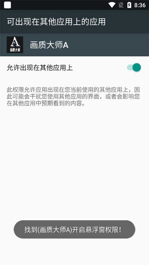 4、在应用列表里找到【画质大师A】,把它的权限调整为“始终允许”,这样就能打开悬浮操作面板了。
