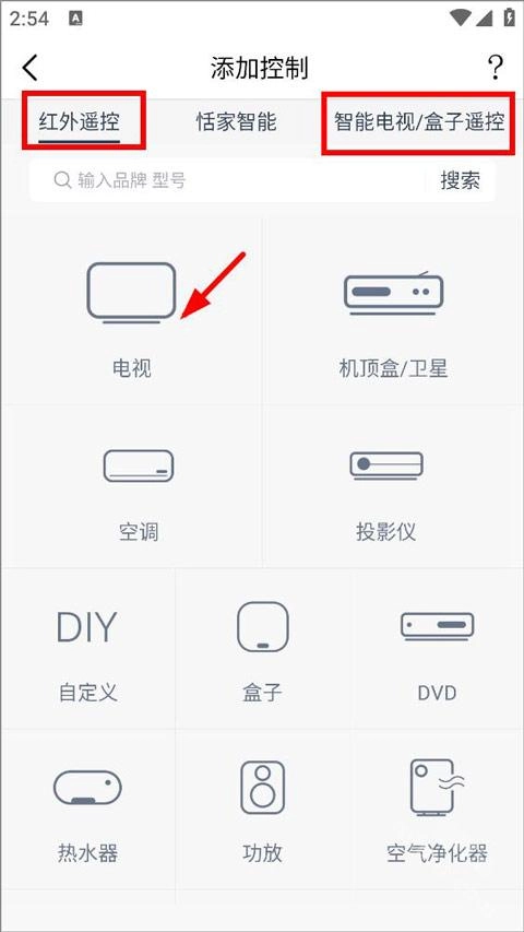 进入添加控制页面后,用户可以选择红外遥控,也可以选择智能电视/盒子遥控。