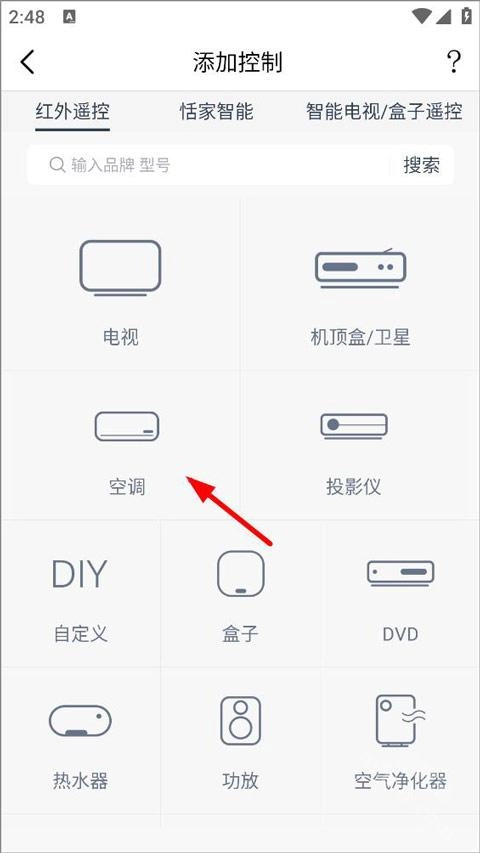 3、进入设备添加页面后,用户在红外遥控类目里选择空调。