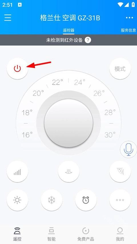 5、打开空调遥控器,按下红色按钮就能检测到红外设备并启动空调。