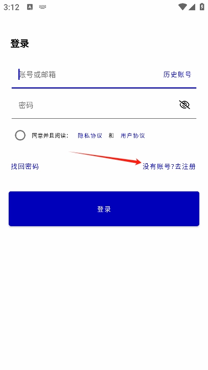 2、注册与登录:接着打开应用,点击“没有账号?去注册”。