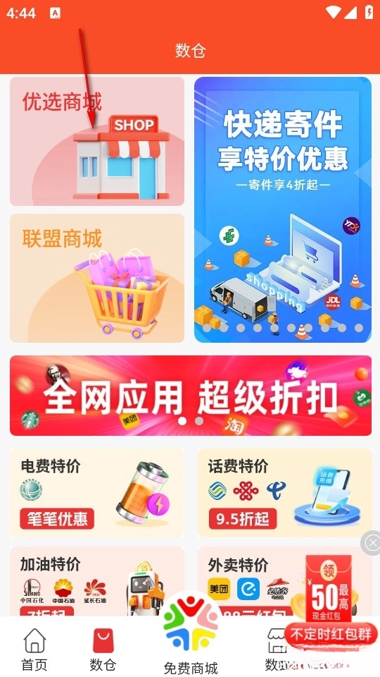 接着我们进入数仓界面,下方展示的都是亲火购物平台自家的商品,要是想查看优选商品,可以选择进入优选商城。