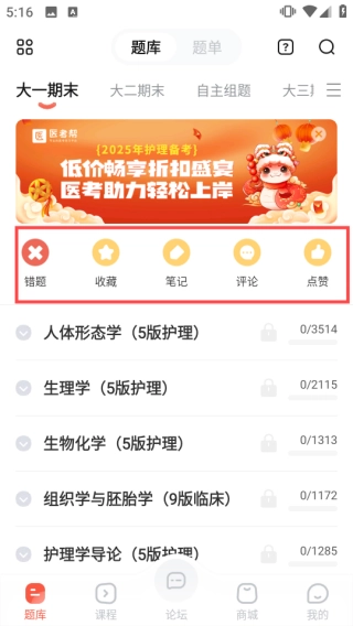 1、在题库界面里,能借助【错题】【收藏】【笔记】【评论】【点赞】这些功能来管理学习内容。
