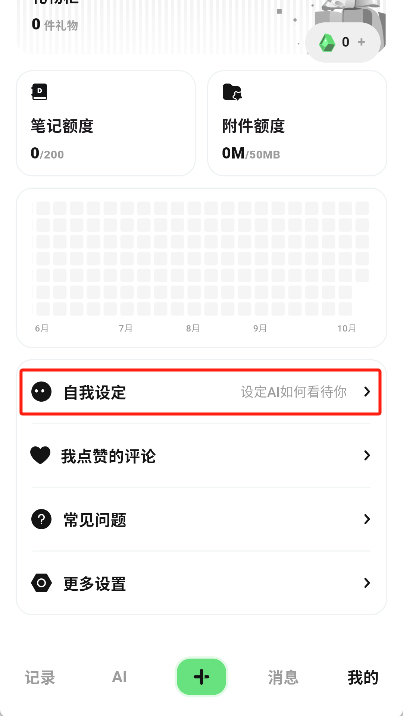 4、在“我的”板块里,你可以找到并选择“自我设定”选项,接着点击页面右上角的“+”按钮,输入你需要的相关信息,这样就能创建属于自己的AI角色了。