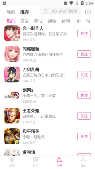 包括爱与制作人、闪耀暖暖、剑网3、王者荣耀、和平精英等多个游戏的圈子,相同的游戏爱好可以让你在此找到更多志同道合的朋友