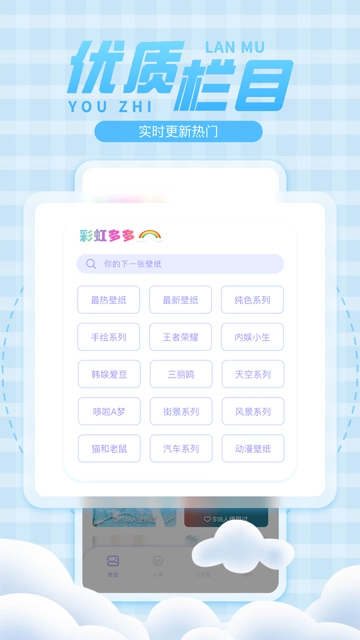 彩虹壁纸是一款风格多变的主题美化手机应用,这里有超多有想法的主题素材,想找高清图片直接搜就行,不用花钱。以后发朋友圈、微博或者QQ空间,再也不用为配什么图发愁了。这么多好看的图,随时想搜都能找到,点一下就能搞定,特别方便!软件里还有各种各样的高清壁纸,贴在手机上特别合适。平时刷手机的时候看着舒服,心情也能变好。