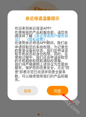 1.安装并打开亲近母语,点击同意