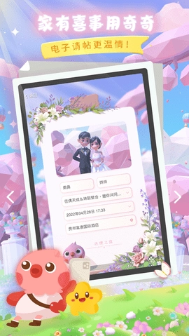 奇奇是一款功能丰富的婚庆应用,除了能协助用户组织与举办婚庆活动外,还具备信用体系加成、私域流量管理、识图导入、活动提醒、便捷投票、精准快速识别、活动发现、温馨电子请柬、礼簿查询等一系列实用功能。无论是婚庆活动的筹备阶段,还是喜事的邀请及礼物管理环节,奇奇都能为用户带来便利与支持。用户借助奇奇,既能简化办事流程、提升事务效率,还能体验到更多社交互动的乐趣。