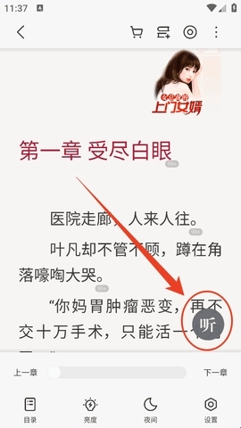 3、轻轻点一下就能调出阅读器的菜单,接着你会看到一个大写的“听”字,再点一下就可以了。