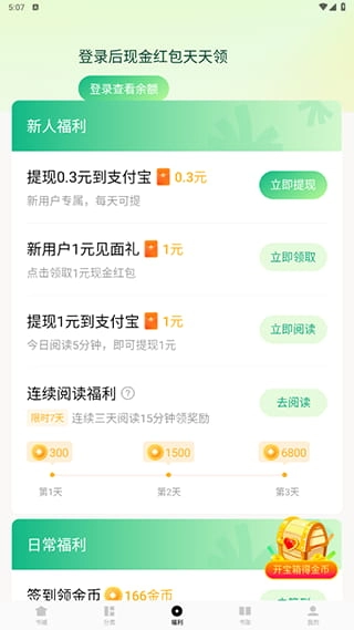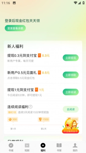 1、用户能够通过每日签到和阅读操作获取少量金币奖励,并且可以完成快速提现到账。