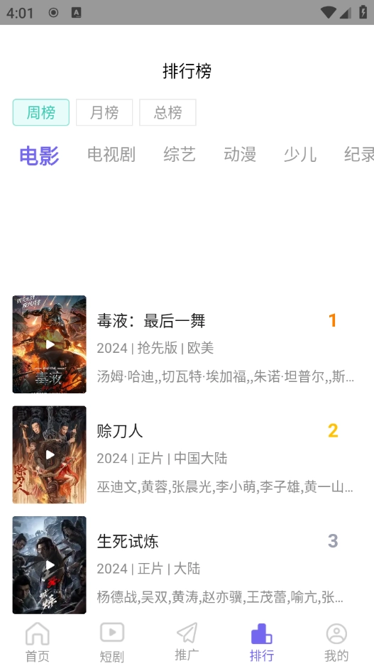5、排行榜涵盖周榜、月榜与总榜,用户能够查看当下最热门的剧集。