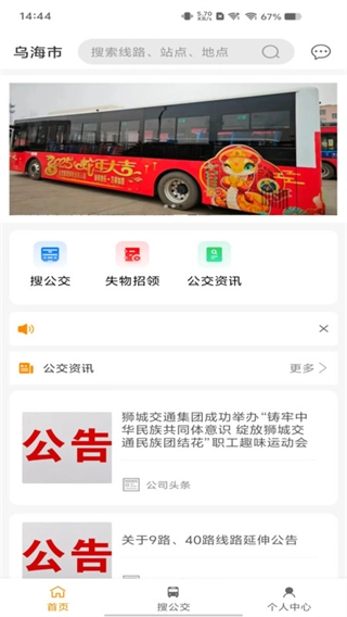 1、启动乌海智慧出行应用,点击底部导航栏的“搜公交”选项,即可进入公交线路查询页面。