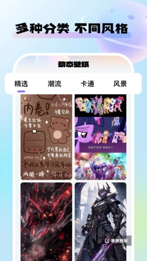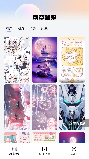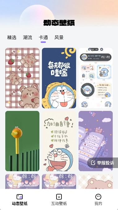 软件对壁纸进行详细分类,包括潮流、卡通、风景等。