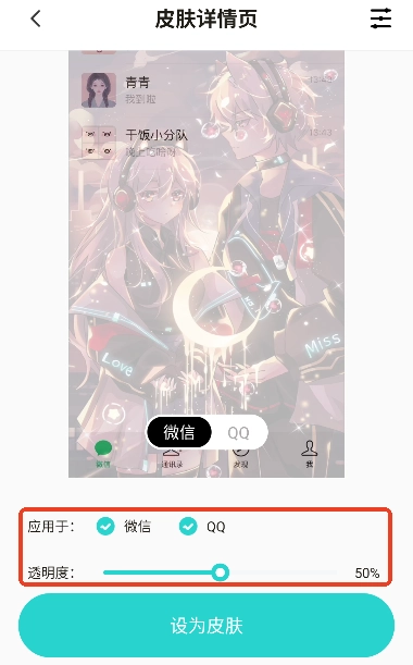 3、依次点击【应用皮肤】和【设为皮肤】,即可将其设置为微信与QQ的皮肤。