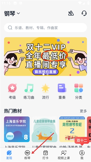 1、点击底部“练琴”按钮,进入练琴功能页面。