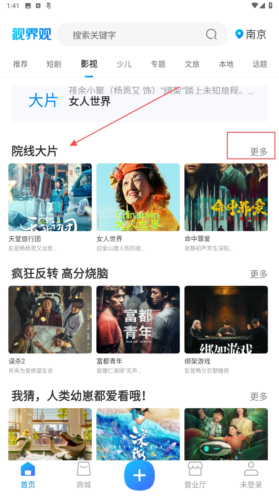 3、在【影视】频道里,点击【院线大片】分类下的影片封面,就能查看影片详情并播放影片;点击【更多】,则可以浏览更多影片。