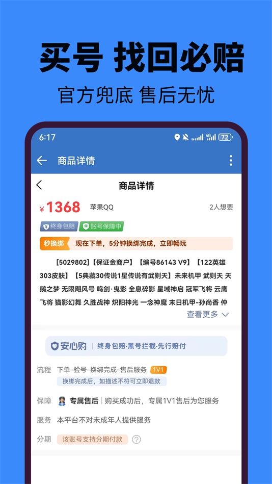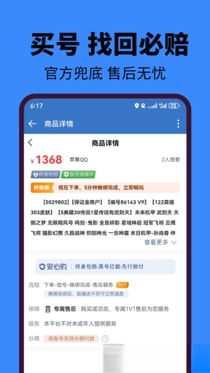 3.在首页挑选心仪账号,签订电子协议后就能完成购买,还享有包赔保障权益。