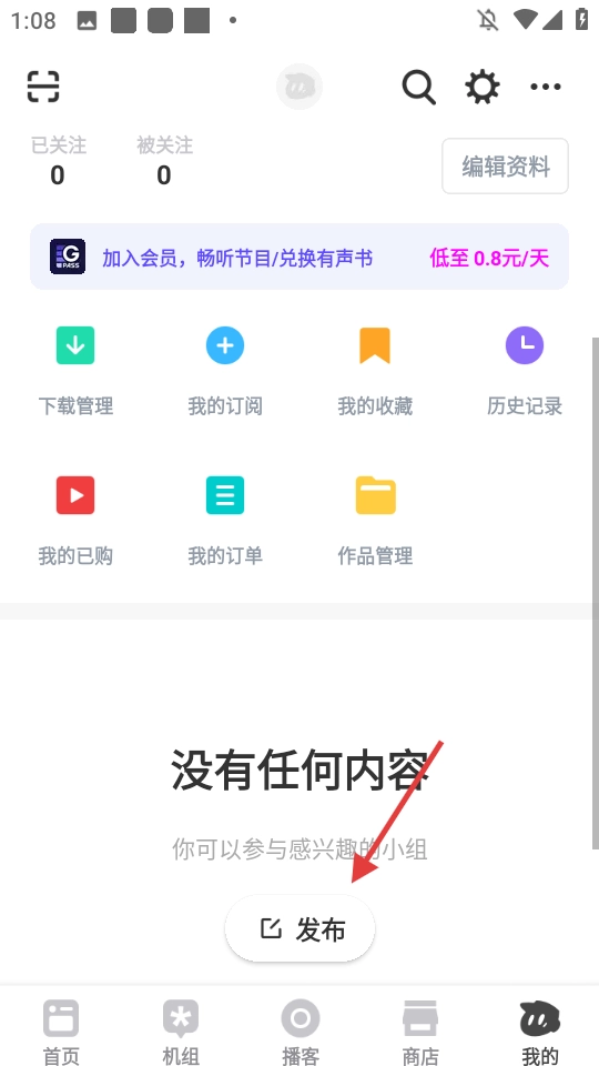 2、在个人页面点击【发布】,进入动态页面。