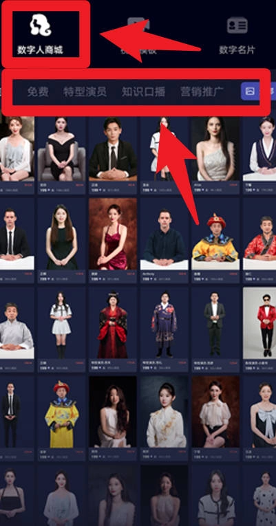 3、进入数字人商城页面后,能够浏览演员、知识口播、营销推广等不同类型的虚拟角色,可满足多种场景的使用需求。