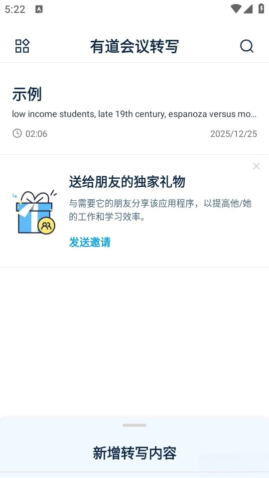 《有道会议转写》是一款能够帮助用户将语音转成文字或文档,能够ai记录并形成文档的一款实用语音文字记录转写软件,用户能够使用这款软件进行各种各样的转录工作,这款软件能够帮助用户通过语音转文字的方式进行会议记录,同时也能够帮助用户由文件输出为语音,是一款强大的转写工具。