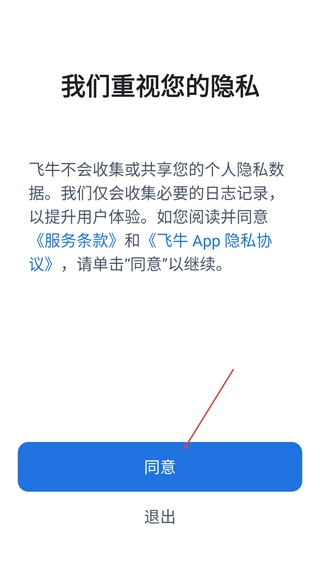 1、首次打开飞牛应用,阅读《服务条款》与《隐私协议》后,点击“同意”按钮,进入应用登录页面。