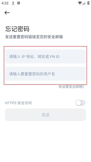 3、进入“忘记密码”页面后,请按顺序填写“IP地址/域名/FNID”与“需重置密码的用户名”这两项内容。