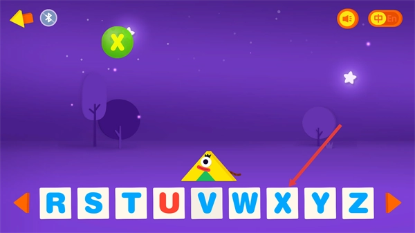 4、继续在字母序列中,将上方的【X】字母对应到下方字母栏的【X】位置,推进字母学习的匹配任务。
