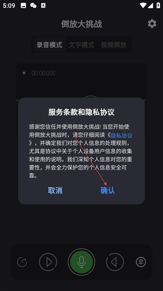 1.打开“倒放大挑战”并阅读确认《服务条款和隐私协议》后进入主界面