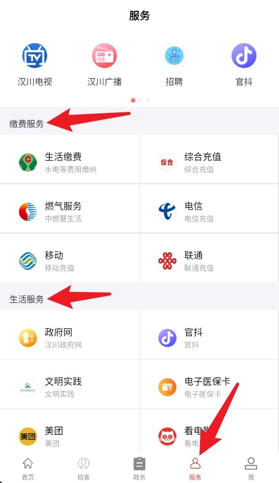 3、服务页面分为缴费与生活服务两类,涵盖水电缴费、通信充值与政务入口。