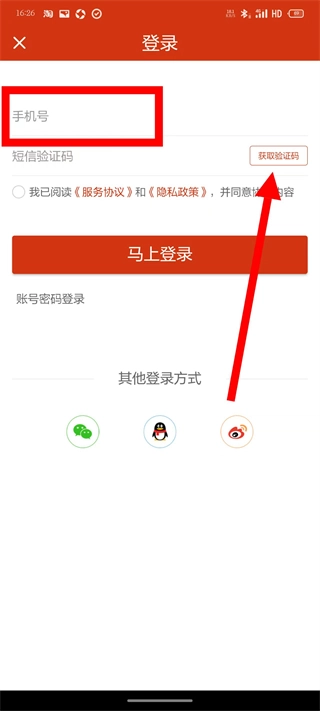 3、在登录页面,输入手机号,点击获取验证码。