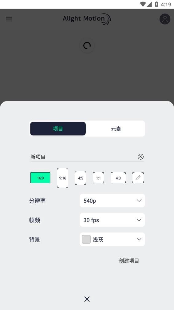 2、创建新项目,依次选择屏幕比例、分辨率、帧频及背景样式;