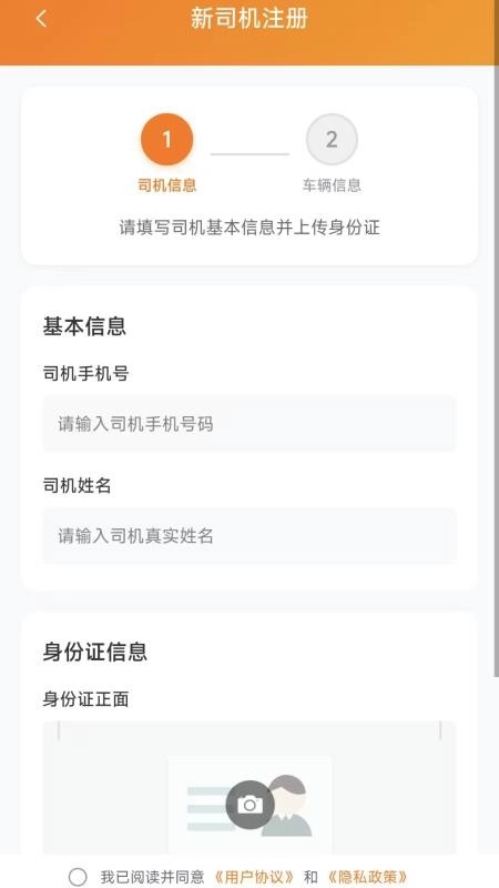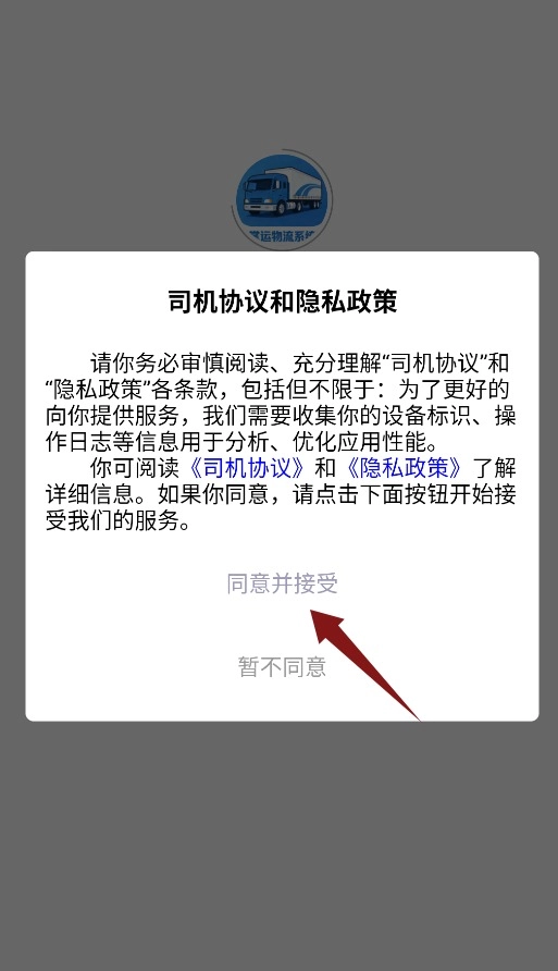 1、首次启动应用需点击同意司机协议和隐私政策,确认后方可进入。