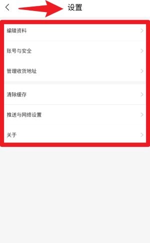 5、点击设置选项进入后可编辑个人资料、修改账号安全选项、管理收货地址以及清理缓存信息。