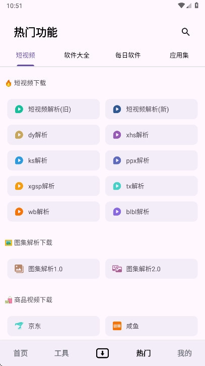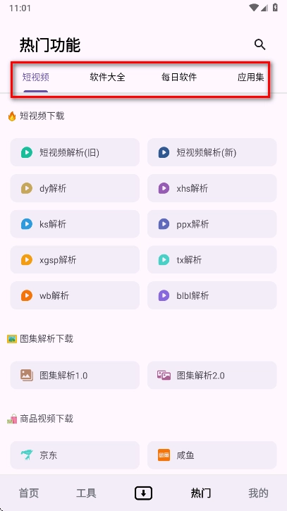 5、可以看到上方主要分为短视频、软件大全、每日软件、应用集等板块内容。