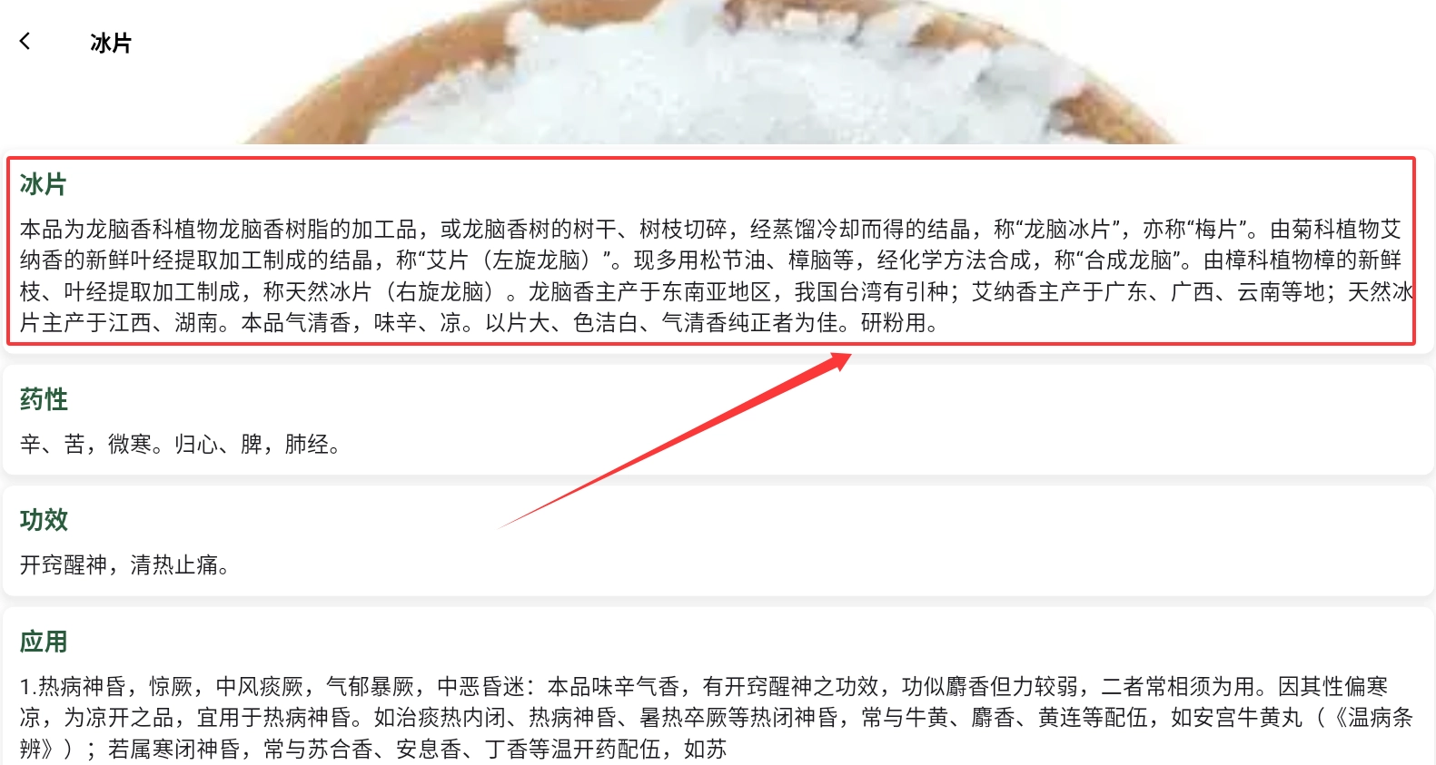 2、看到冰片,昆布这些药材卡片时,点击一下就能查看详细的性味归经和功效,想了解哪个就点哪个,非常方便。