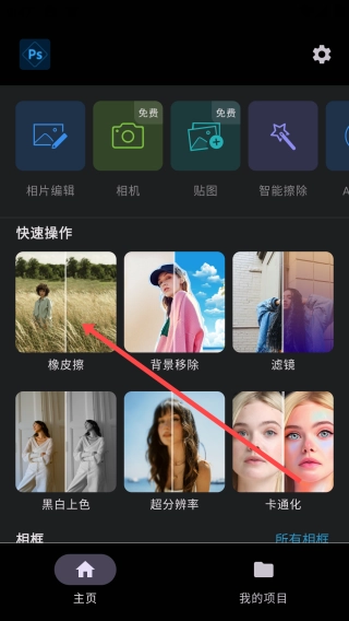 1、打开Ps,点击【橡皮擦】
