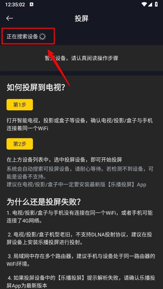 1、电视、投影或盒子与手机未连接至同一WiFi网络,也可能是手机连接的是4G网络。