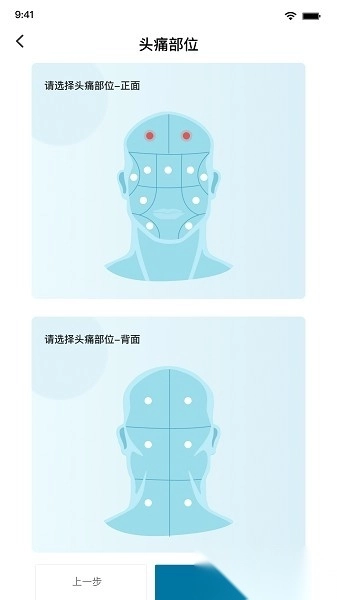 2. 可视化疼痛部位选择器,点击头部3D模型即可标记不适区域;