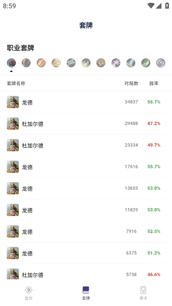 职业强度排行榜每日更新三次,涵盖标准模式与狂野模式双环境数据。点击任意职业即可查看该职业所有主流卡组的构成详情,其中包括单卡替换方案以及对阵各职业的胜率曲线。