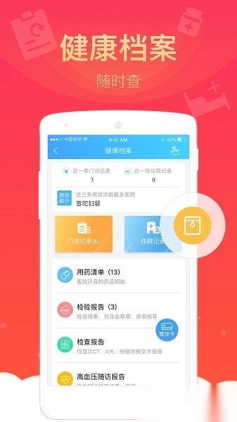 健康档案随时可查:完整记录公立医疗机构的诊疗信息与体征数据;