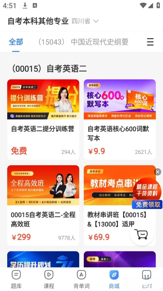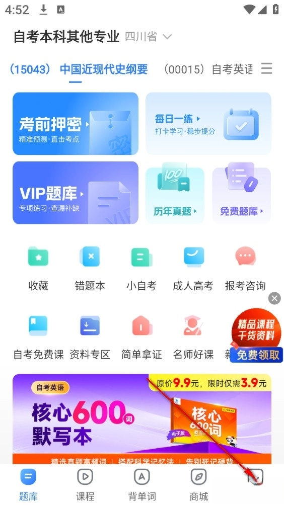 自考之了题库是一个为自考、成考、国开、中专以及成人英语(涵盖自考英语、学位英语、公共英语三级、零基础英语)等各类考试提供备考支持的一站式学习平台,这里不仅有海量题库可供免费刷题,还有精品课程能免费领取。