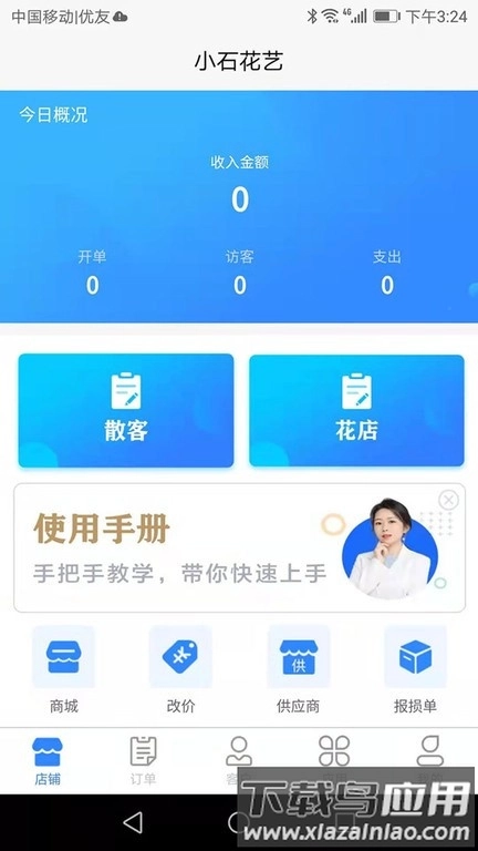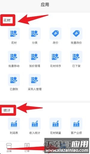 5、点击“应用”栏目,能够使用花材管理、分类、改价、批量操作等功能,还可以在统计板块查看利润、收入以及客户业绩数据。