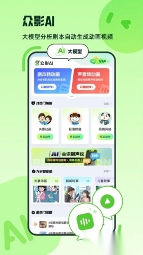 众影AI是深圳市图易拾贝科技有限公司推出的智能视频创作工具,致力于协助用户快速产出原创动画内容。借助先进的AI算法技术,它能将用户提供的文本剧本、热门段子或是音频文件,自动生成为鲜活的动画视频,有效降低了动画制作的专业门槛。不管是想制作沙雕搞笑类的动画,还是精致的动漫作品,用户都不需要具备专业的剪辑能力,仅通过简单的操作步骤就能完成高质量的视频制作,让创意表达变得更轻松、更高效,感兴趣的朋友可以尝试体验一下。