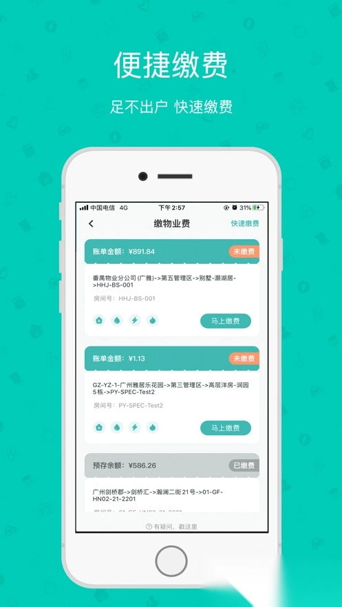 智能缴费功能支持在线缴纳水电煤气等各类日常费用,操作流程简单便捷。