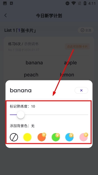 4、在标记面板中,你可以设置熟悉度数值、挑选背景色,以此完成对单词的个性化标记,从而辅助后续的单词复习。