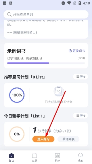 1、打开背单词应用后,在首页找到“今日新学计划”板块,点击该板块中的【进入练习】按钮,即可进入单词学习卡片页面。