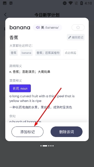 2、在今日新学计划页面,点击目标单词(例如banana),就能查看该单词的详细释义、音标等相关信息。