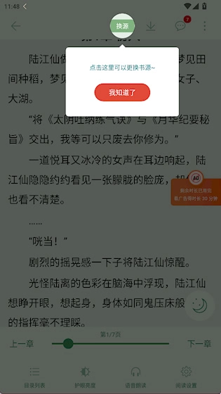 3、进入阅读界面,可以点击上方的换源进行切换
