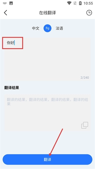 3、在输入框内填入【你好】,核实内容无误后点击底部的【翻译】按钮,以此触发翻译功能。
